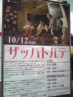 11月のライブスケジュール◎11/7(金)◆京都◆ 『恋の季節はヨーロピアンでナイト』 @拾得 出演: ◇ハッチハッチェルバンド ◇ザッハトルテ 時間:open 17:30~/start 19:00~ お問い合せ: 拾得 tel.075-841-1691 *ハッチェルさんとのセッションは毎回燃えます! ◎11/17(月)◆京都◆ ザッハトルテ『月例お食事ライブ』 @さらさ西陣 (鞍馬口智恵光院東入ル) 時間:open 18:30 / start 19:30~ 料金:No Charge / カンパ制(要オーダー) お問い合わせ: さらさ西陣 tel.075-432-5075 *第3月曜はザッハの月例ライブでございます! ◎11/21(金)◆神戸◆ ザッハトルテの『ボジョレー・ヌーボー&スペシャル・ディナーライブ』 @BRASSERIE TOOTH TOOTH(神戸市中央区) 時間:open 18:30~/お食事スタート start 19:30~/ライブスタート 料金:4500円 食事付き (※要予約) ◆お好きな前菜、メインをお選びいただけるプリフィックス・スタイル・メニュー +ボジョレーヌーボー(特別メニュー) その他のドリンクとデザートは別途となります。 ◆メール及び店頭チケット販売: 10月1日より予約開始 お問合わせ: ブラッスリートゥーストゥース)078-332-3052 *再びオシャレスポット神戸へ。 ディナーとワインのお供にザッハトルテの音楽はいかが?? ◎11/22(土)◆名古屋◆ ザッハトルテの『隔月お食事ライブ』 @Cafe Dufi (千種駅から徒歩5分) 時間:open 19:00/start 20:00~ 料金:前売2500円/当日2800円 *限定50席 お問い合わせ&予約) カフェ・デュフィ tel.052-263-6511 *今年最後、奇数月のDufi生音ライブ! 頑張りまーす! ◎11/23(日)◆東京・お台場◆ TOKYO FM Recomends 『クリスマスライブ atアクアシティお台場』 @アクアシティお台場(お台場) 時間:start 14:00~ 出演: aluto/ザッハトルテ MC:原田美樹 [問]tel.03-3221-0880(TOKYO FM リスナーセンター ◎11/23(日)◆東京・下北沢◆ 『AROUND THE WORLD 秋の街角編』 @下北沢440(東京) 時間:open/start 17:30~ 料金:前売2300円/当日2800円 出演: LIVE: コケストラ/踊ろうマチルダ/ザッハトルテ DJ:佐藤彰(東京ロンドン化計画/VOICE)/ 宮奈大(fascinating rhythms)/ ひげぼ(SWING KIDs)/ HIDE(SWING KIDs) メール予約:swing@y3.dion.ne.jp [問]tel.03-5481-4143[2PM-8PM] (下北沢440 -four forty-) ◎11/28(金)◆京都◆ <ブリキサーカス>にゲスト参加します! @Urbanguild (三条木屋町下がるニュー京都ビル3F) 時間:OPEN 18:30/START 19:30~ 料金:前売1800円/当日2000円(1ドリンク付)出演:『ブリキサーカス』 ・伊藤栄治/ドラム ・ウエッコ/ウクレレ ・渡部智義/ベース ・クリストファー・フライマン/トランペット ・横山祥子/バイオリン ・山きょん/クラリネット ・Qちゃん/アコーディオン ・都丸智栄/アコーディオン W)釘宮一也のひみつきち、RAW elements 問い合わせ: Urbanguild 075-212-1125 *メンバー多いなー。 きっとカオスやな~ ◎11/29(土)◆京都◆ 第38回 憲法と人権を考える集い KBS京都TV 公開生放送 『裁判員 de ちゅう』 (11:00~11:55) ★<ザッハトルテ>が番組に生出演します。 ライブ演奏: 14:15~/15:15~ 場所・京都駅ビル4F室町小路広場 [0回] 2008年 09月 23日| ライブスケジュール&メディア出演予定|Comment(0)